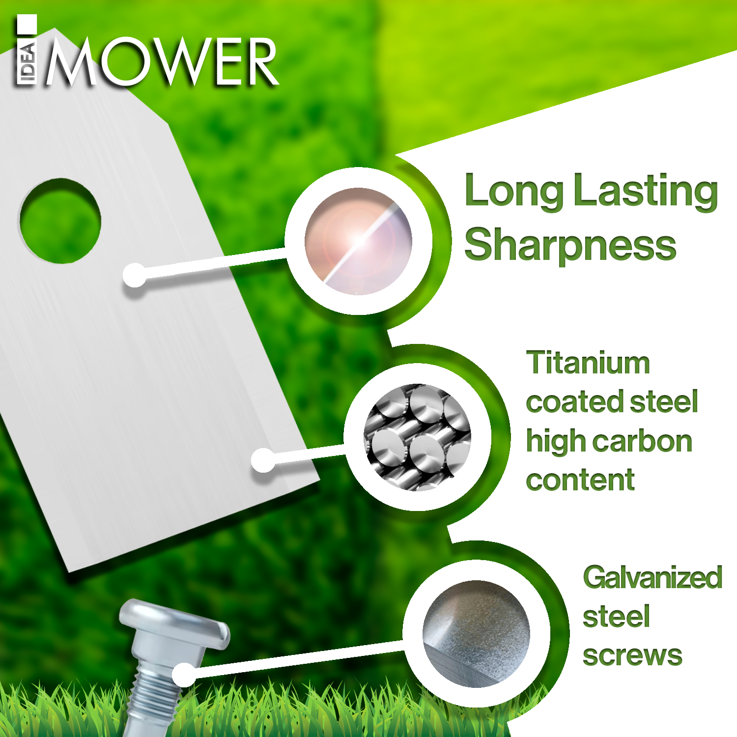 Segway-Mähroboterklinge aus titanbeschichtetem Kohlenstoffstahl mit verzinkten Schrauben. Text: “Long lasting sharpness”.